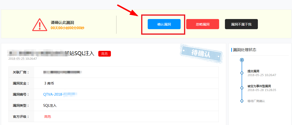 漏洞提交后补天审核团队会确认漏洞是否有效,审核通过后我们会通过各方渠道积极与厂商取得联系,因此在“审核”完成后通常需要7天左右的时间等待厂商认领及处理。当有厂商认领处理漏洞后,通常1-2个工作日内我们就会确认该漏洞。如果7天以内没有厂商认领漏洞,7天之后1个工作日内我们就会确认该漏洞。