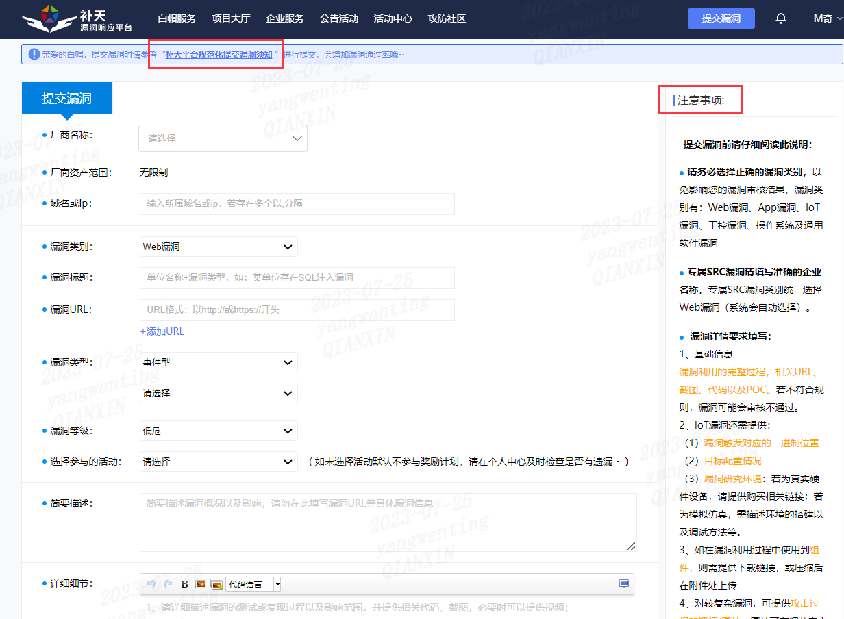 2.可以参考规范化提交漏洞须知以及右侧注意事项,按要求填写提交即可