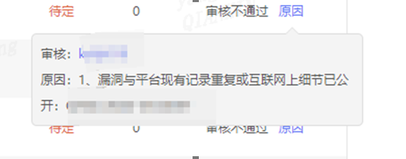 登录自己的账号,在个人空间【漏洞列表】页面,审核不通过后面有“原因”,鼠标放在上面即可查看不通过的原因
