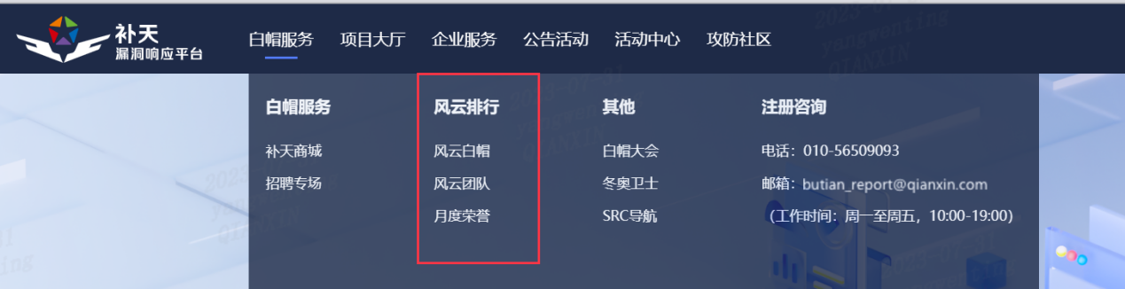 点击白帽服务-风云排行可以查看补天榜单情况