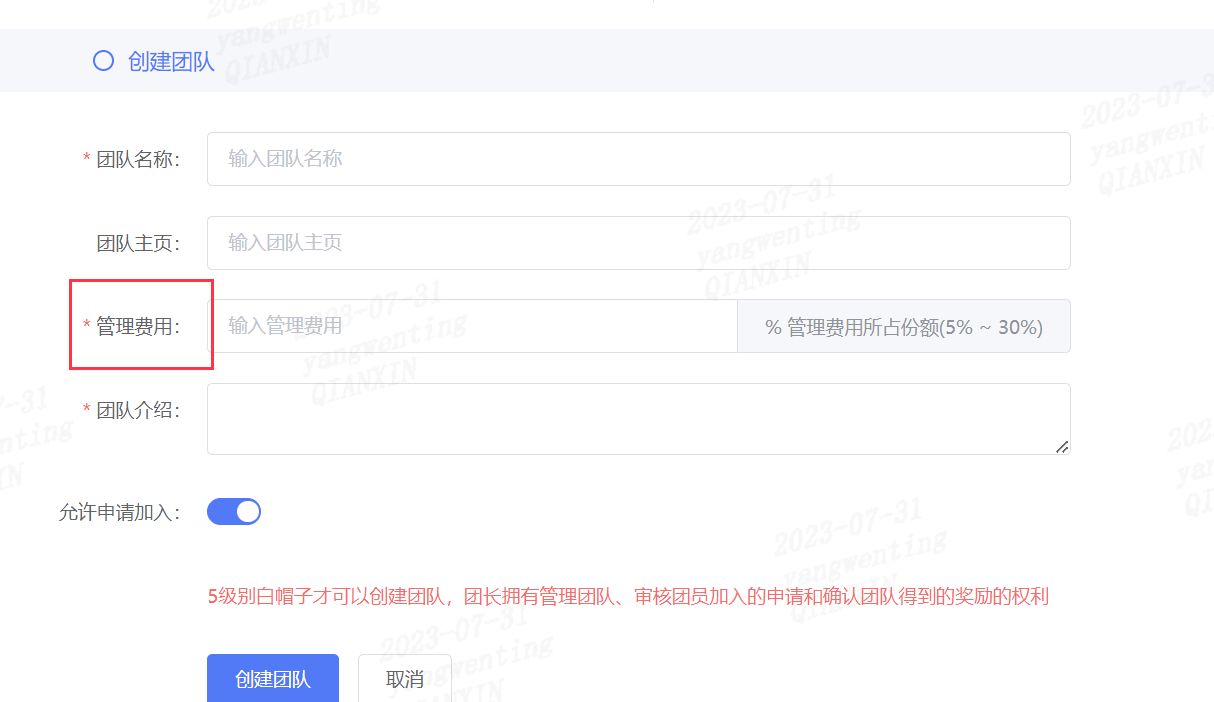 5级别白帽子才可以创建团队,团长拥有管理团队、审核团员加入的申请和确认团队得到的奖励的权利,管理费用是指当该团队上榜或者参与活动获得奖金后,奖金会先扣除X%给到队长作为管理费,其余根据贡献进行分配。