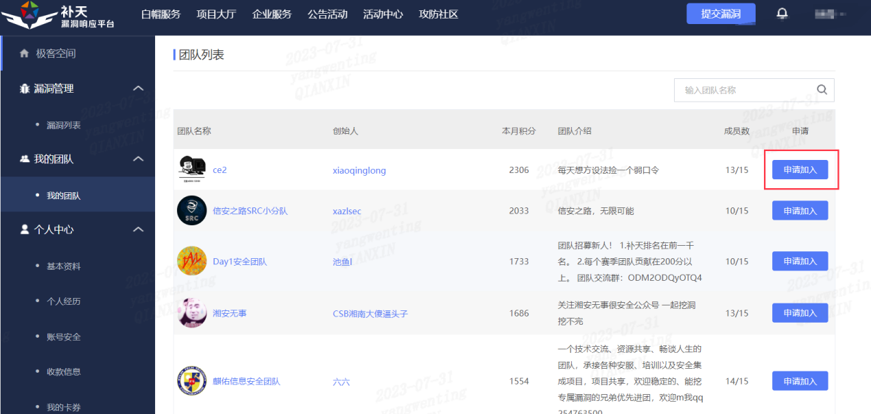 点击想要加入的团队并申请即可,需要联系队长或者运营进行审核